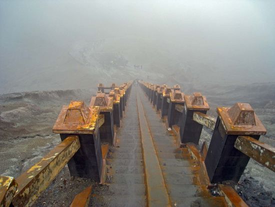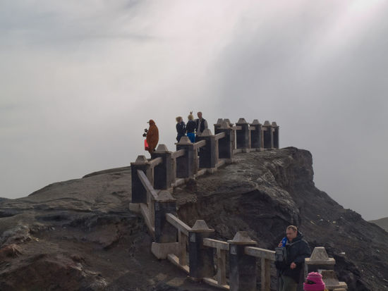 draußen wurde es plötzlich heller und man erkannte die suppe aus wolken und nebel, die genau ueber und um uns herum hing. ob das noch aufbricht? wir begannen zu zweifeln... zu fuß gings noch etwas weiter hoch, bis zu einer plattform mit gelaender, die einem wahrscheinlich eine tolle aussicht auf die vulkanlandschaft bot. wir warteten bis es heller und heller wurde und hofften, dass die sonne aufging und die nebelschicht durchbricht.