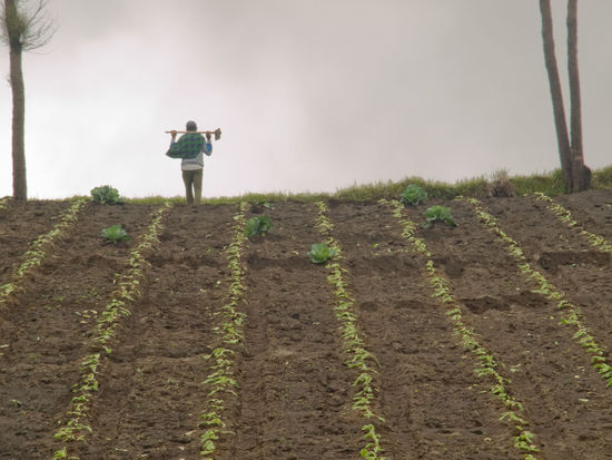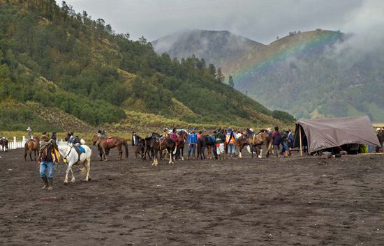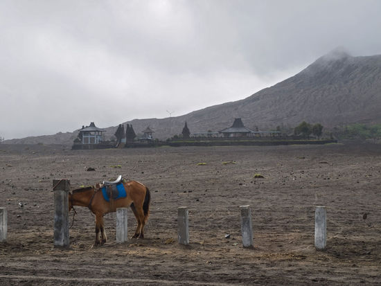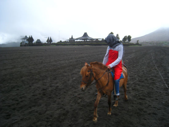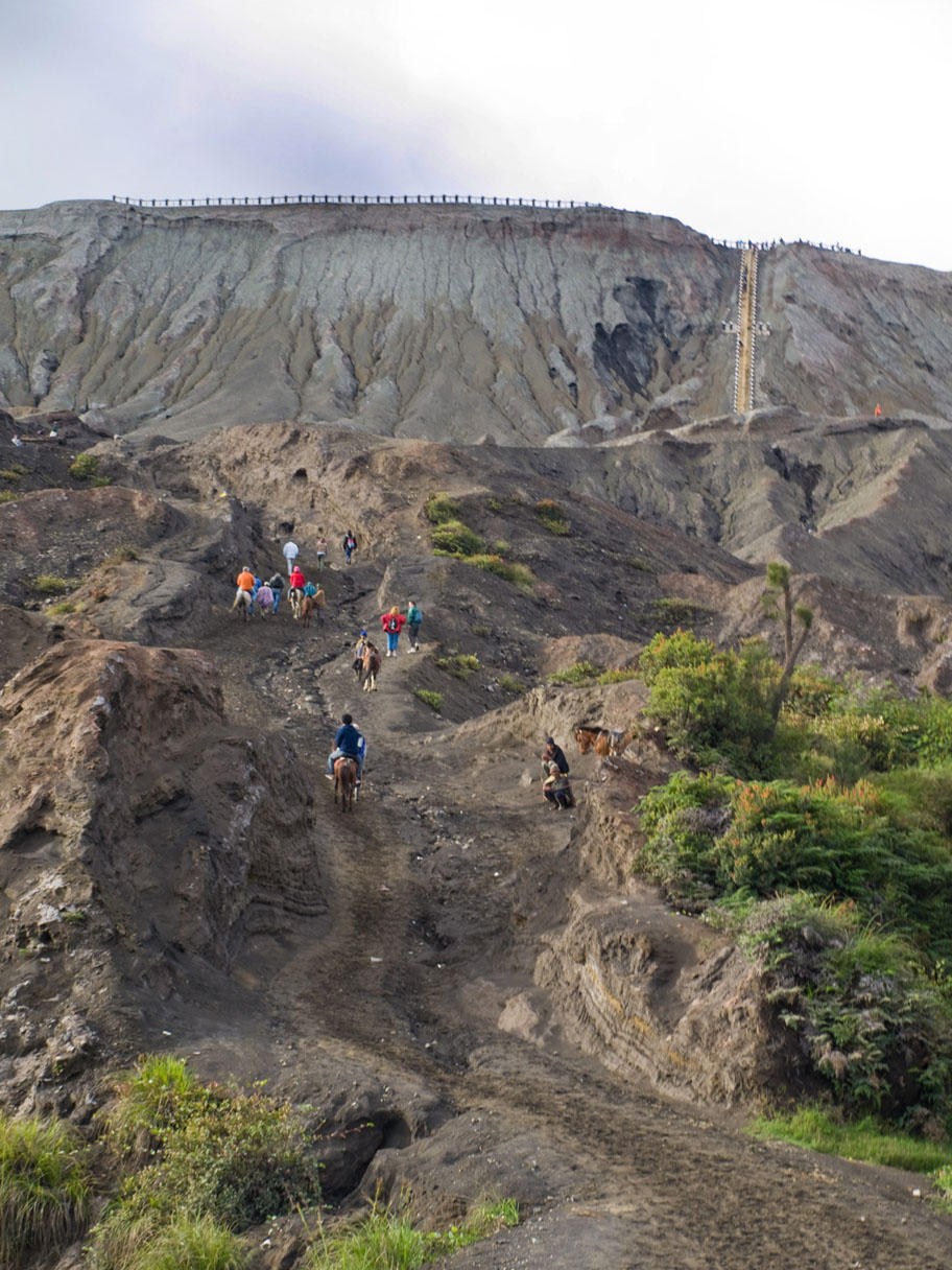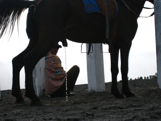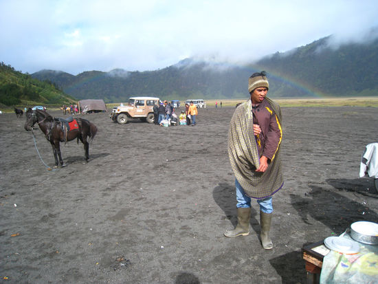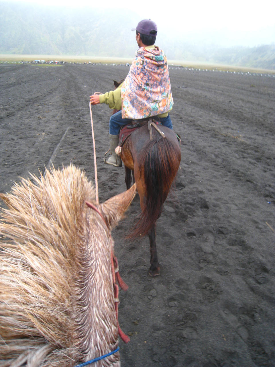 dann gings weiter richtung mount bromo und als wir anhielten um zu parken, waren wir ploetzlich wie aus dem nichts umringt von dutzende bergbauern auf ihren kleinen pferden, die alle die arme zum jeepfenster hinstreckten, weil sie uns ein pferd anbieten wollten, dass uns gar bis zum krater tragen koenne. aufgrund der uebermenge an angeboten und da wir den weg ohnehin lieber zu fuß bewaeltigen wollten, schlugen wir alle angebote aus.