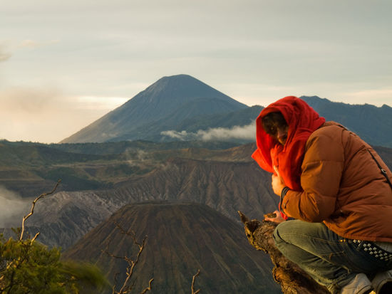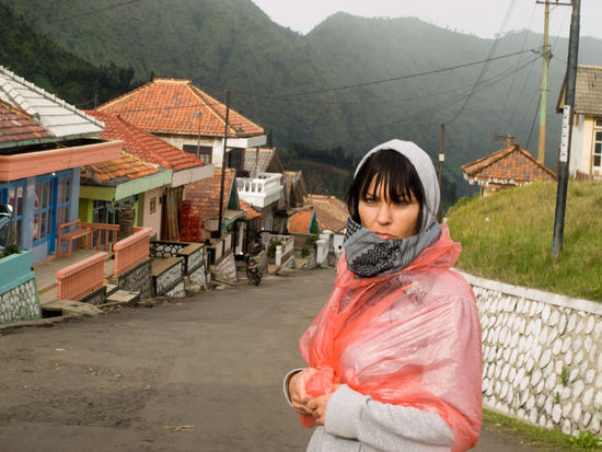 wir stiegen also um in den jeep und der fahrer fuhr los. man konnte nur soviel sehen, wie die scheinwerfer nach vorne strahlten. es ging ein stueck abwaerts, dann lange auf einer ebene und dann ziemlich lange und ziemlich steil aufwaerts zum aussichtspunkt penanjakan (immerhin 2.770m hoch!). naeher am ziel waren dann auch noch ein anderer jeep und drei motorraeder hinter bzw. vor uns. oben angekommen stiegen wir aus und es kamen schon ein paar jungs auf uns zu, die uns dickere maentel und jacken mit kapuze ausleihen wollten und fuer IDR 10.000 pro mantel (= ca. EUR 0,90) nahmen wir das gerne an. es war wirklich extrem kalt und leichten spruehregen gabs auch noch. also ran die jacken und kapuze rauf!