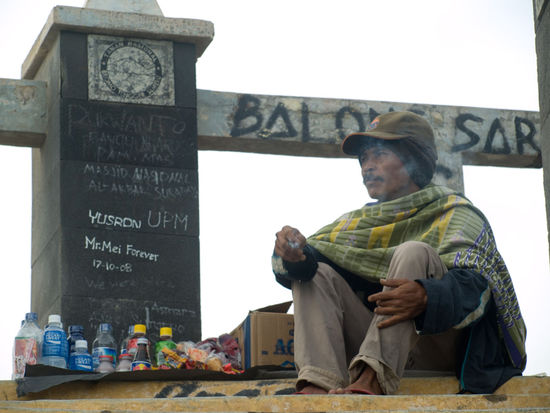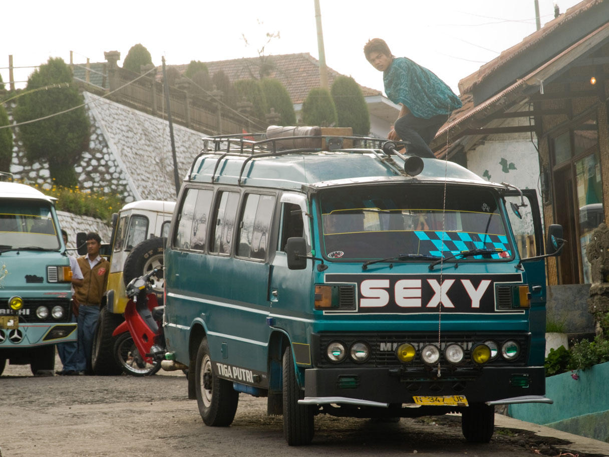 die faehre dauerte keine zwei stunden und dann erneut eine rasante busfahrt bis man uns dann in probolinggo ausgeladen hat (die fahrt soweit kostete ca. IDR 490.000). hier stiegen wir in einen kleinbus um, nur wir beide. es war mittlerweile etwa 2 uhr nachts. die beiden fahrer fuhren uns zu ihrem buero (eine kleine betonhuette mit einem stuhl drin, einem tisch und einer landkarte. der schluessel zur tuer war unterm huettendach versteckt. der chef war zu klein geraten, aber der andere konnte den schluesel herunterangeln) und konnten uns dank der fruehen stunde gleich zu einer jeeptour zum aussichtspunkt und zum vulkan ueberreden, fuer ganze IDR 400.000! sie brachten uns also erst hoch ins dorf cemoro lawang, welches sich direkt am rande der rund 820.000 jahre alten caldera/kraterlandschaft des bromo-tengger-semeru nationalpark befindet. das dorf liegt in gut 2.000 metern hoehe und die auffahrt dauerte locker nochmal 1 ½ stunden. dort oben eiskalt und stockdunkel!