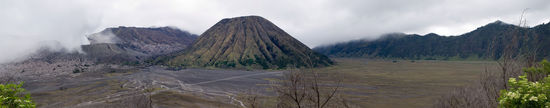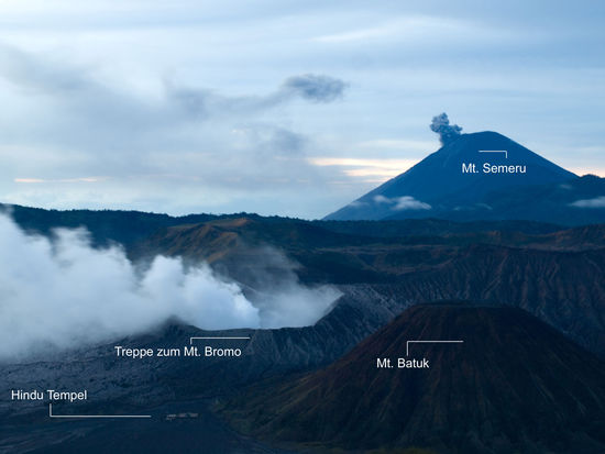 im vordergrund z.b. der mount batuk (den wir gestern auch schon von unten sehen konnten). dann erkennt man den mount bromo (2.329m), den wir gestern schon erklommen haben, und sieht, dass die nebelschicht dort, die einem im wahrsten sinne des wortes den atem raubt, eigentlich gar kein nebel, sondern schwaden von schwefelrauch ist!!