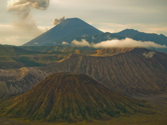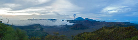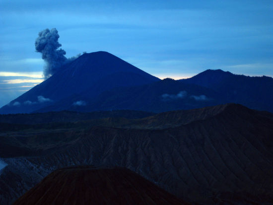 und ganz hinten erhebt sich der große vulkan mount semeru (mit 3.676m der hoechste berg javas!), der etwa alle 20 minuten riesige staub- und rauchwolken ausspukt, manchmal gepaart mit stein und asche!