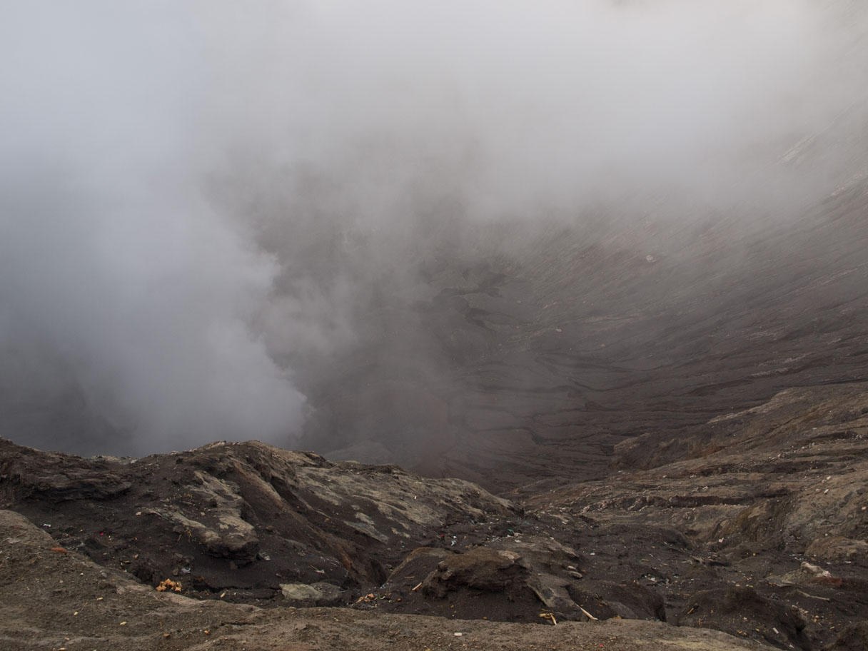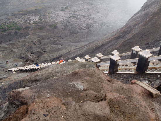 aber die maenner hatten recht, der weg war mehr als beschwerlich! es regnete, war kalt und der sandboden machte es zunehmend anstrengender einen fuß vor den anderen zu setzen. aber wir hielten durch und erreichten irgendwann endlich den mount bromo! jetzt nur noch die 250 stufen nach oben steigen und wir stehen am kraterrand!!