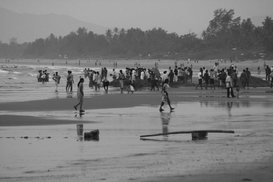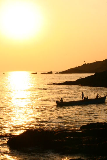 Wir kamen mitten in der Nacht in Gokarna an und haben uns zu einem der abgelegenen Straende in der Naehe fahren lassen, weil wir dachten, an Sylvester ist dort bestimmt noch ein Zimmer frei. Um zum Strand zu gelangen mussten wir allerdings noch ein gutes Stueck zu Fuss zuruecklegen. Der Weg dorthin war lediglich ein kleiner Trampelpfad und fuehrte durch Dschungel und ueber Felsen und Berge, und sowas dann in der Nacht und mit gefuehlten 100 kg Marschgepaeck auf dem Ruecken. Irgendwann nach einer halben Stunde kamen wir auf eine Lichtung, von der mehrere Wege abgingen. Da standen wir nun! Nachdem sich ein paar Erkundungstrupps aufgemacht haben, um die verschiedenen Wege auszukundschaften (dabei aber recht unangenehme Zusammenkuenfte mit Hunden hatten oder vor einem Abhang oder in einer Sackgasse landeten) entschieden wir auf der Lichtung zu uebernachten, bis die Sonne aufgeht. Als es dann hell wurde, war vieles leichter und wir erreichten den Strand sehr bald. Dort waren nur leider alle Zimmer besetzt und wir fuhren mit dem Boot zum Gokarna main beach und wurden dort endlich fuendig.