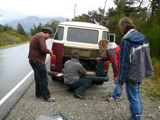 Ich hatte einen super Auftackt mit dem "Cruisin' Dude" (so nenne ich den Bus bisher). Also ich mit Volker und Dani (dem Paerchen das schon 27 Monate auf Flitterwochen ist) von El Boslon Richtung Bariloche fuhr ging auf halber Strecke der Motor aus.(Anm. des Autors: Diese Geschichte kommt auch in ihrem Buch "einmal verrückt sein" von Daniela Effenberger vor)