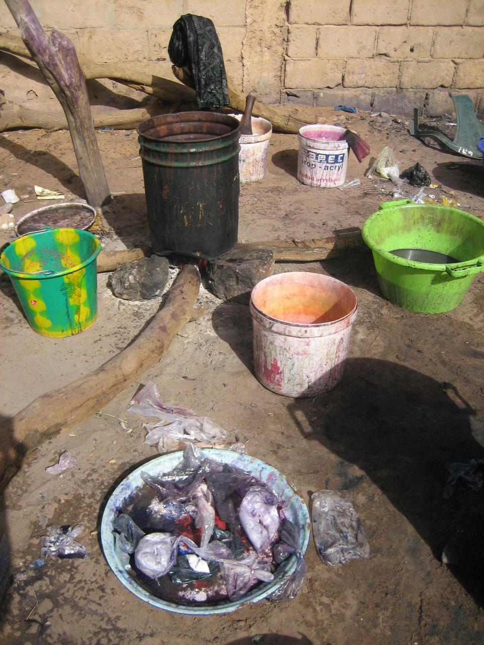 So beeindruckend es auch war die ausgefeilten Färbetechniken kennen zu lernen, war das ja nicht der eigentliche Grund unseres Besuches. Worauf wir hauptsächlich achteten, waren mögliche Gefahren für die Gesundheit der Färberinnen und ihre Umwelt. Und da sind uns eine Menge Sachen aufgefallen! Das Farbpulver und andere Pulver zum fixieren der Farben kaufen die Färberinnen abgepackt in kleinen Plastiksäckchen. Diese werden dann aufgerissen und das Pulver in große Bottiche gestreut. Handschuhe tragen sie dabei nicht und so kommen sie immer wieder mit den Pulvern in Berührung, wovon eines auch unter dem Namen "Natronlauge" bekannt ist. So kommt es dann auch schon mal vor, dass sich die Färber bei der Arbeit Verätzungen zuziehen. Die leeren Plastiktütchen werden dann oft ins Feuer geschmissen oder fliegen mit dem Wind davon. Am meisten Sorge bereitete mir aber, dass hin und wieder auch ein kleiner Junge (er war vielleicht gerade mal 2 Jahre alt) zwischen den arbeitenden Frauen rum lief und von den vorhandenen Gefahren keine Ahnung hatte.