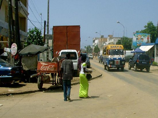 Kommt man auf die größeren befahren Strassen so ist man mitten im Arbeitsalltag der Bevölkerung angekommen. Auf Pferdewagen werden Gasflaschen und Colakisten durch die Hitze gefahren, Taxis in ihrer typisch gelb schwarzen Farbe fahren zwischen uralten Renault und sonstigen gerade noch fahrtüchtigen Gefährten auf der aus Sand und Asphalt bestehenden Strecke und versuchen den unzähligen Schlaglöchern und Schutthaufen auf ihrem Weg auszuweichen. Die Fußgänger schlängeln sich auf den Randstreifen und am Straßenrand durch die Strasse und kommen fast genauso schnell wie die motorisierten Verkehrsteilnehmer voran. Die Strassen werden von weiteren kleinen Geschäften gesäumt, meist in der Größe einer Garage, mit einer Theke am Eingang und einem hinten gelegenen Lager, das meist randvoll mit Waren gepackt ist.
