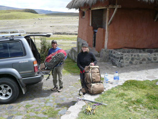 Wir wurden an diesem morgen von unserem Guide (Henry) um 9:00 Zuhause abgeholt. Und wir fuhren mit seinem Gelándewagen richtung Park Nacional Cotopaxi. In der letzten Stadt vor dem Park (Machachi) gingen wir mit Henry alle Dinge Einkaufen die wir fúr die náchsten zwei tage brauchten. Wir waren ein bisschen erstaunt wieviel Esswaren Henry einkaufte, den es sah so aus als wúrde dies fúr eine Woche reichen. Nach dem wir alles hatten stiegen wir ins Auto und fuhren Richtung Nacional Park los. Ab hier wurde der zustand der Strasse grottenschlecht und wir fuhren durch kleine Bauerndórfer. Nach circa 1h geholper kammen wir endlich zum Eingang des Nacional Parks. Dort stiegen wir kurz aus den Henry musste uns dort anmelden und Eintritt bezahlen. Wir waren faszieniert von der Landschaft, und dem Gigantischen Berg (Cotopaxi) der weit weg doch riesig erschien. So gross habe ich In mir doch nicht vorgestellt. Wir fuhren ein kurzes stúck weiter wo wir in einer kleinen Berghútte das nótigste Matriall was wir fúr die náchsten zwei tage brauchten bereitstellten und in unsere Rucksácke packten. Den Rest liesen wir in der Berghútte zurúck und fuhren mit dem Gelándewagen weiter (auf noch schlechteren Strassen bzw. Wanderwegen)bis wir nicht mehr weiter kammen und stellten dort das auto auf ca. 4500m ab. Von dort an mussten oder durften wir laufen, auf ca. 4800m wo sich die ACS hútte befand in der wir úbernachten werden. Als wir dort ankammen bereitete Henry fúr uns das Mittagessen zu, was wir auch brauchten den Káti und ich hatten grossen Hunger was auch mit der Grossen hóhe zutun hatte. Nach dem Essen hatten wir eine Schulung im Umgang mit Steigeisen, Eispickel und Seilschaft. Schon war es Zeit fúr das Abendessen, was Henry zubereitete und auch sehr kóstlich schmeckte. Jetzt war gerademal 18:00 und es hiess zeit fúrs Bett, wir gingen ins Bett und legten uns ein bischen hin, wobei von Schlafen kan um diese Zeit keine Rede sein, mit 30 anderen Leuten im Zimmer und zudem war die Hútte sehr kalt (0ºC) dies war fúr uns jedoch kein Problem den wir sind ja gut Ausgerústet.