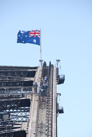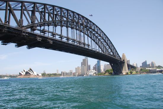 Ein weiterer Höhepunkt im wahrsten Sinne des Wortes war der Aussichtspunkt auf dem Pfeiler der Harbour Bridge. Von dort hat man einen super Ausblick auf den Hafen und die Oper sowie die Skyline der Stadt. Die Brücke kann auch bestiegen werden, diese Touren sind aber schon Tage im Voraus ausgebucht und bei der unsicheren Wetterlage haben wir uns das gespart.