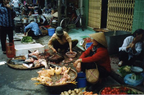 Auf der Rückfahrt nach Hanoi sehen wir Reisfelder, typische Dörfer und auch Märkte mit exotischen Angeboten.