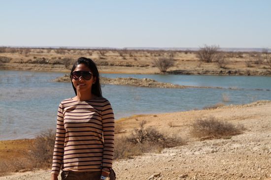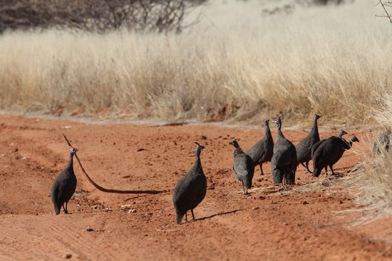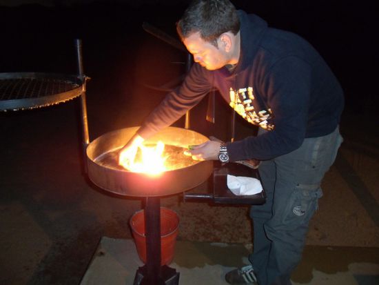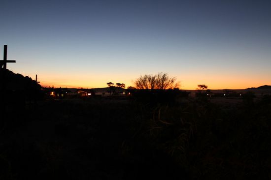 Als wir am Nachmittag nach einer kurzen Erkundungsfahrt in der Gegend zurueckkamen, hatten viele Leute schon mit dem Grillen begonnen. Wir wunderten uns, warum unsere Bestellung noch nicht da war. Auf nachfragen hiess es, die Anderen haben Ihre Bestellungen schon vorher bei der Partnerlodge abgeholt. Wir dachten uns Nichts dabei und haben unsere Bestellung puenktlich um 18uhr bekommen. Leider wurde es jetzt schon dunkel, weshalb das wohl der Grund war, dass die Anderen die Sachen schon vorher abgeholt hatten. Als wir alle Sachen gegrillt hatten und wir uns an den Tisch setzten ging es los: erst dachten wir es waren ein paar lachende Gaeste. Als das Lachen/Heulen um uns herum schlagartig umging war uns bewusst, dass uns Schakale umkreist hatten. Wir haben wie von Wespen gestochen alles zusammengepackt und sind ab ins Zelt. Da war uns nicht mehr zu lachen zu mute und uns lief ein Schauern ueber den Ruecken. Im Nachhinein lachen wir darueber. Nach dem Essen mussten wir allerdings alles spuelen und die Kochnische war natuerlich draussen. Also, Am hat abgewaschen und ich habe uns den Ruecken freigehalten.... jaja liebe Leser, lacht nur! Ich habe immer mal wieder mit meiner Camera ins dunkle geblitzt und es waren immer Augen zu sehen. Die Schakale waren denke ich so 20m von uns entfernt. Nach getaner Arbeit und dem ganzen Schreck sind wir in unsere Schlafsaecke und wir hatten einen guten Schlaf. Morgens haben wir auf unserer Terrasse die Abdruecke der Tiere gesehen. Also, scheu kann man das nicht nennen.