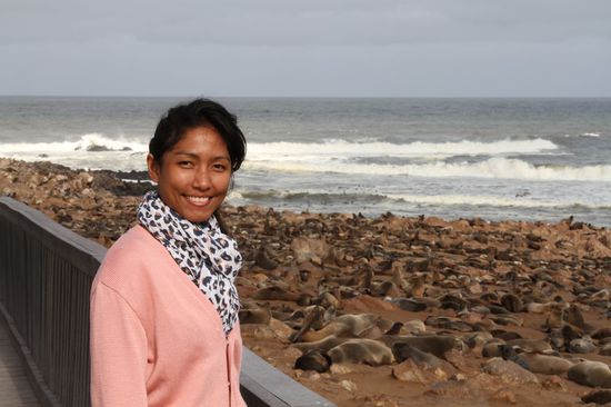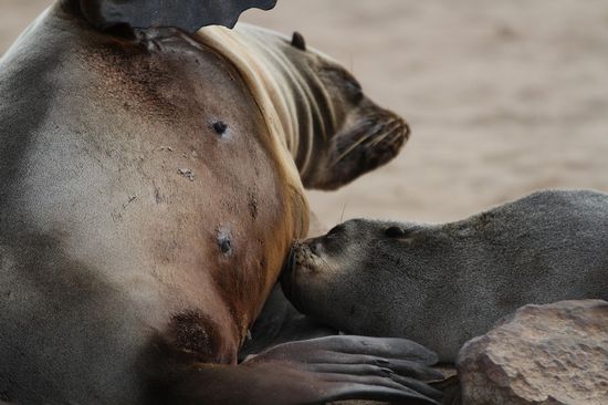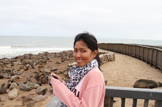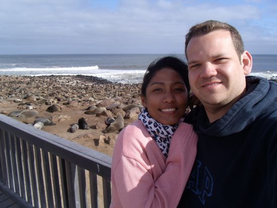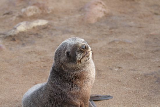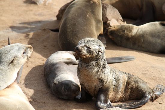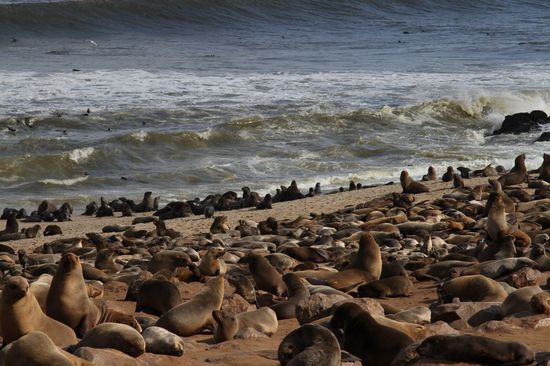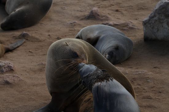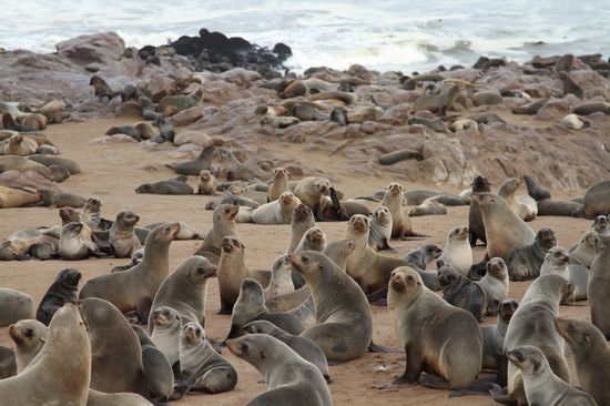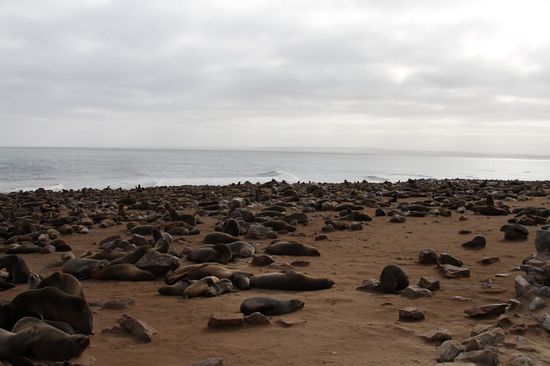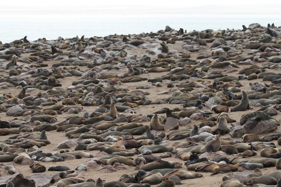 An diesem Tag ging es dann Richtung Damaraland. Wir haben aber am Tag zuvor erfahren dass Cape Cross (Seehundkolonie) noch recht interesant ist. Deswegen sind wir noch frueher aufgestanden und uns ausserplanmaessig noch nach Cape Cross auf den Weg gemacht. Von Swakopmund ca. 120km. Die Strecke war sehr gut und zuegig zu fahren. Es sind dort unzaelige Seehunde, der absolute Wahnsinn. Laut Flyer den wir an der Parkrezeption bekommen haben immer zw. 80.000-100.000 Tiere. Der Eintritt hat wieder 170N$ fuer 2 Personen und Auto gekostet. Uns hat vorher keiner gewarnt, wie abartig es dort stinken wuerde. Ich bin aus dem Auto ausgestiegen und habe einen Schlag bekommen. Ich bin aus Thailand schon viel gewohnt und auch abgehaertet, aber das war eindeutig zuviel! Ekelhaft und mir hat es schon im Hals gestanden. Der gestank kommt denke ich von dem ganzen Urin, toten und verwehsenden Tieren, die zw. den Anderen liegen. Bei sovielen Tieren laesst sich das nicht vermeiden und es geift auch kein Mensch dort ein. Sie meinten, wenn die Menschen sich dort naehern wuerden, bekaemen die Tiere Panik und wuerden die kleinen, Neugeborenen ueberrennen und waeren tot (was wir auch festellen konnten). Dort haben wir es nicht so lange ausgehalten und sind dann bald wieder Richtung Damaraland gefahren.