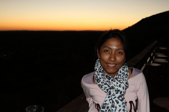 Diesmal waren es 430km mit ca. 150km Teer bzw. Salzstrasse, das geht dann schon. Der Weg dorthin war schon anstrengend und ermuedend. Ich kann aber als kleinen Tip geben nicht die C35 durchzufahren, sondern eine kleine Abkeurzung ueber Sorris Sorris die D2319 zu fahren. Dieser Abschnitt hat mir Landschaftlich bisher mit am Besten gefallen, da man viele Tiere wie zum Beispiel Strausse, Wildpferde, Esel, Echsen und Elefanten sehen kann! Gegen 15Uhr sind wir in der Damara Mopane Lodge angekommen. Hier waren wir doch sehr ueberrascht wie luxurioes diese ist. Damit hatten wir gar nicht grerechnet. Diese hat erst vor 3 Monaten eroeffnet. Um 17Uhr war Treffpunkt zum Sonnenuntergang im Berg hinter der Lodge. Es wurde auf ca. 250m Hoehe eine Terasse eingerichtet die fuer Sonnenuntergaenge genutzt wird. Es gab alle moeglichen Getraenke die man dort oben haben mochte, das war schon klasse. Diese Lodge koennen wir uneingeschraenkt weiterempfehlen. Im Sommer sogar mit grossem Pool!