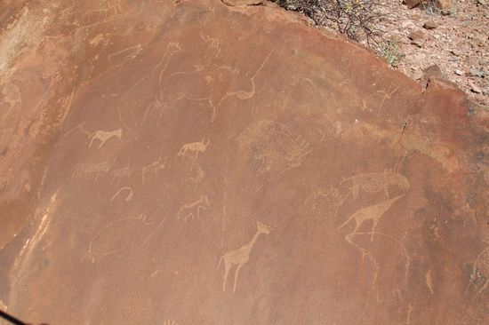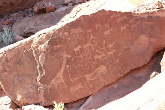Danach ging es weiter zu den Felsgravuren (100N$ fuer 2 Personen + Trinkgeld fuer den Fuehrer der zwingend notwendig ist). Hier waren wir etwas enttaeuscht da wir uns mehr erhofft hatten. Es wurden 2 Touren angeboten: eine 30min und eine 50min. Wir haben uns fuer die groessere entschieden. Wir wurden durchs Gelaende gefuehrt und haben diversen Gravierungen in den Felsen begutachtet. Das wars dann schon. Nicht so dolle wie erhofft. Es gibt nichts Weiteres darueber zu berichten.