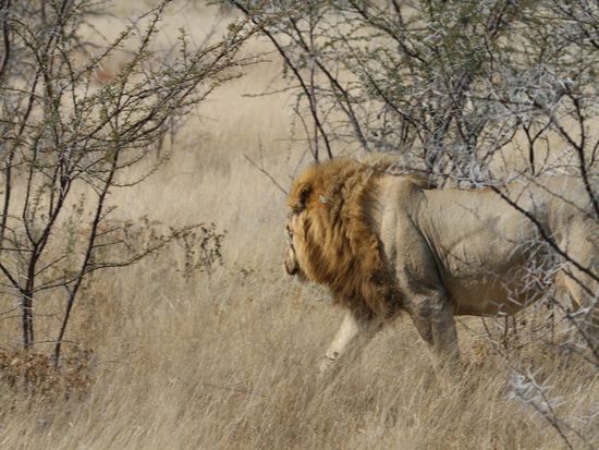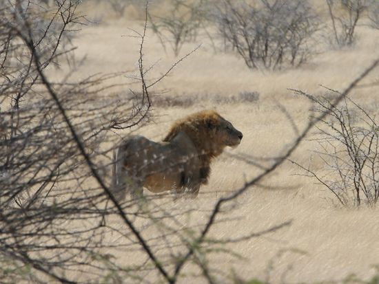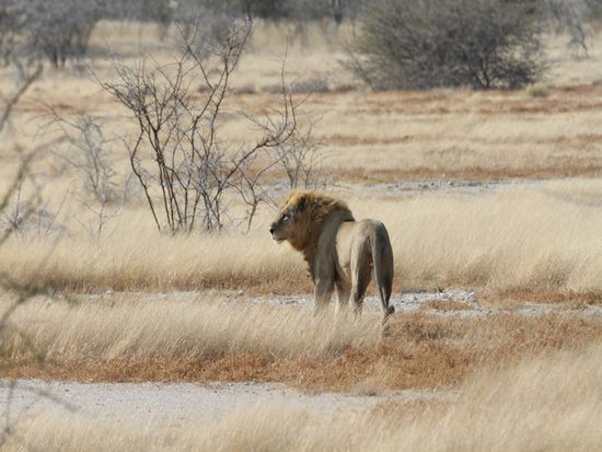 Wir haben 4 Tage lang nach Loewen im Park gesucht, alles vergeblich. Auf der Fahrt vom Camp raus zum Gate ist uns doch tatsaechlich noch eine Loewe ueber den Weg gelaufen. Der kroenende Abschluss von Etoscha.