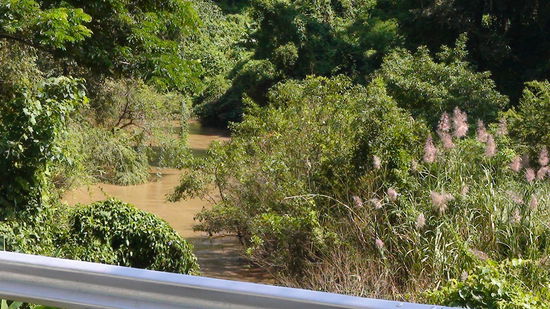 Die Strassenverhaeltnisse sind jetzt nicht mehr ganz so gut. Zeitweise regnet es stark und es ist so feucht, dass ich nur mit offenem Visier fahren kann. Dieses beschlaegt sonst sofort, auch wenn ich alle Luftschlitze des Helms oeffne. Also peitscht mir staendig der Regen ins Gesicht, zum Teil so stark, dass es schmerzt. Aber das macht nichts, ich habe trotzdem grossen SANUK, das gehoert einfach dazu!. Zudem habe ich ueber meine Motorrad-Kombi Plastikhosen und -Jacke angezogen, ich bin also voellig wasserdicht verpackt. Zeitweise komme ich mir vor wie der allergroesste Abenteurer aller Zeiten.