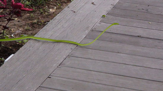 Und wenn mit der natuerlichen Umgebung und der Natur alles stimmt, dann gibts hier im Norden Thailand eben auch dies... Ich sitze so da und schluerfe geniesserisch meinen Kaffee, als ich durch den spitzen Schrei einer nebenan arbeitenden Gaertnerin aufgeschreckt werde. "Nguu,nguu" (Schlange!). Und wirklich, keine zwei Meter von meinem Tisch entfernt schlaengelt sich so ein Viech auf die Terrasse in meine Richtung. Ich, auf der ganzen Welt ja bekannt als "cool man", hebe doch immerhin meine Fuesse etwas vom Boden weg, bevor ich sie fotografiere. Sie ist wirklich mindestens zwei Meter lang und mit ihrer neongruenen Farbe sieht sie ziemlich giftig aus (obs stimmt?)