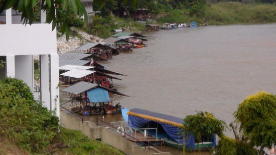 Nach einer Stunde oder so erreiche ich dann Chiang Khong. Diese Stadt ist unter Travellern bekannt als Uebergang nach Laos. Von hier, resp. dem laotischen Nachbardorf, Houei Xai, starten die Flussboote nach Luang Prabang. Ich checke im Ruanthai Sopaphan Resort ein, wo ich mir zum ersten Mal seit meinen drei Wochen in Thailand Mosikito- oder Flohstiche hole. Normalerweise habe ich mit diesen Wesen ja ein Abkommen: ich lasse sie in Ruhe und sie lassen mich in Ruhe. Ich habe nicht mal ein Moskitomittel dabei. Aber hier gilt dieser Waffenstillstand offensichtlich nicht und ich werde an den Haenden und Fuessen arg zerstochen. Wahrscheinlich sind es Floehe aus dem Bett. Das Hotel ist eigentlich sehr schoen, vollstaendig aus Teakholz, was aber den Nachteil haben kann, dass die Raeume sehr ringhoerig sind. Insofern hatte ich aber wieder Glueck, denn meine Nachbarn waren ein junges Thaipaar, das die halbe Nacht sehr liebevoll miteinander umgegangen ist. Wohlverstanden, sie hatten keinen Sex miteinander, haben aber lange zaertlich miteinander gesprochen und gefluestert. Es war wirklich anruehrend und hat mich ueberhaupt nicht gestoert.