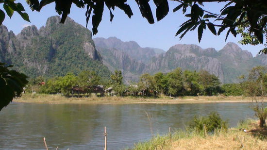 Am Abend dann geniesse ich mein erstes Lao-Essen, wobei ich danach ziemlich suchen muss, weil sich die Restaurants hier offensichtlich total auf den Touri-Geschmack eingestellt haben. Aber ich finde dann Gehacktes mit Pfefferminz, dazu Klebreis, also doch noch richtiges Lao-Essen. Spaeter erkundige ich dann das Staedtlein. Bei den Touris faellt mir auf, dass es wahnsinnig viel blonde Zwanzigjaehrige Maedels gibt, viele uebergewichtig, mit denen ich nicht viel anfangen kann. Ich stehe ja eigentlich nur auf meine Frau in der Schweiz und dann vielleicht noch, aber nur zum Gucken, auf zierliche Asiatinnen. Naja, mal sehen, ich muss ja nicht hier bleiben. Obwohl, die Gegend ist sehr schoen, die Kalkstein-Berge sehen ziemlich krass aus. Schroff ragen sie aus der Fluss-Ebene.