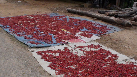 Es ist eine wunderschoene, abwechslungsreiche Gegend mit huebschen kleinen Doerfern. Viele Leute sitzen am Strassenrand vor ihren Haeusern. Kleine Maedchen lausen ihre noch kleineren Geschwister. Vielerorts trocknet Chili auf Matten am Rand der Strasse. Auffallend viele kleine Schweinchen rennen aufgeregt herum, Tausende von Huehnern mit ihren Kleinen. In den Doerfern ist auf der Strasse immer viel los, das ganze Leben spielt sich hier ab. Da muss ich ummer gut aufpassen. Die Kinder winken und jubeln ihr "Sabai Dii". Leider will ich nicht aufdringlich sein und darum fotografiere ich in den Doerfern kaum. Schade, denn das waeren schoene Bilder.
