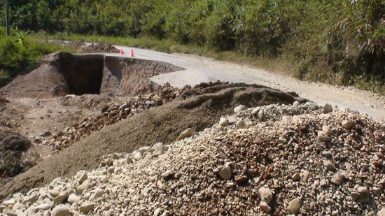 Obwohl der Ort auf ungefaehr zweitausend Metern Hoehe liegen muss, ist es ploetzlich zum ersten Mal seit Tagen schoen warm. Ich kann mir also den Pullover und die Handschuhe ausziehen. Dies mache ich an einer Stelle, die mir schon bei der Hinfahrt extrem Eindruck gemacht hat. Ein grosses Stueck der Strasse ist naemlich weggebrochen und der verbleibende Rest ist genauso breit, dass ein Bus knapp noch durchfahren kann. Allerdings sind die Raeder dann sehr nah am Abgrund.