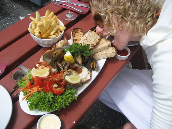 genau das tun wir hier jeden tag...nach unserem letzten bericht aus kaikoura hat mich meine pina zum lunch eingeladen,ein seafood platter mit hummer,jakobsmuscheln,greenlipsmuscheln und prawns,dazu eine flasche eiskalter weisswein - in der sonne genossen wir diesen unglaubliche lunch und konnten unser glueck mal wieder nicht fassen...