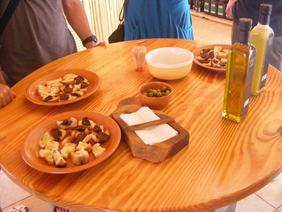 Wir begannen und beendeten unsere Tour also mit guten Weinen und dazwischen gab es Weissbrot mit Olivenoel, sonnengetrockneten Tomaten und gruenen Oliven.