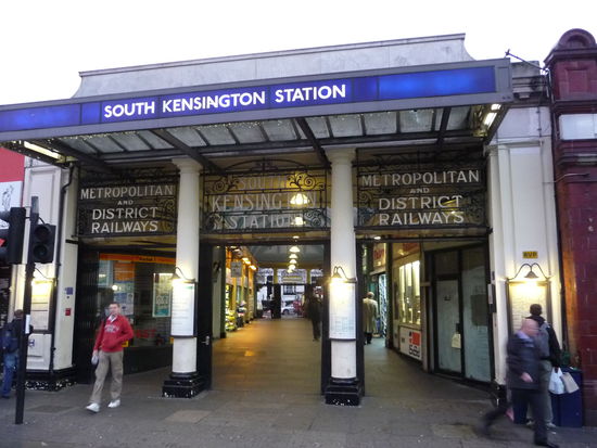 U Bahnhof South Kensington .Hier kreuzen sich Picadilly Linie,District Linie und die Circle Linie.Sehr schön zu sehen hier einer der zahlreichen Stationen mit typischer Terra Cotta Fassade von Architekt Leslie Green der 1908 verstorben ist und bis dahin für den Bau vieler Untergrundstationen in London verantwortlich war ähnlich wie es Alfred Grenander für die Berliner U Bahn war.