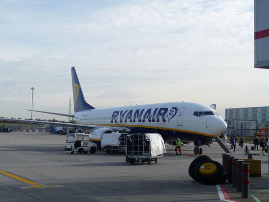 Ryan Air ist die größte Fluggesellschaft in Stansted .Im Hintergrund in der Abendsonne kommt schon unserer Flieger nach Berlin.