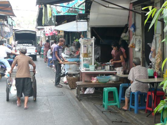 Nach einer sehr geruhsamen und langen Nacht (endlich ausschlafen!) haben wir im Hotel unseren ganzen Kram zusammengepackt und hatten jetzt schon Mühe, unsere Koffer zuzukriegen. Was soll das erst nach 4 Wochen werden?! Da sich Hendi quasi über Nacht überlegt hat, dass man hier ja vielleicht recht preiswert ein neues Handy kaufen könnte, ging's als Erstes wieder ins MBK, direkt in den 4. Stock: Handyabteilung. Dort gibt's wirklich alles, nur leider nicht sonderlich viel billiger als zu Hause, und dann womöglich noch ne chinesische Kopie. Also gab's kein neues Handy. Macht aber nix. Haben uns dann noch mal in den Skytrain gesetzt und sind zur Silom Road gefahren. Das ist das Geschäfts- und Bankenviertel Bangkoks, ein wuselige Straße inmitten großer Hochhäuser. Es wirkt alles sehr europäisch, viele westliche aussehende Geschäftsleute in Anzügen und die Läden reichen von Starbucks über McDonalds bis zu Boots (amerik. Drogeriemarkt). Ein paar Schritte Richtung Norden gelaufen und wir waren im Lumphini-Park, eine riesige Grünfläche mitten in der Stadt, umgeben von Hochhäusern (ein bisschen wie der Central Park in New York). Dort haben wir ein Weilchen am künstlichen See gesessen und uns vom Trubel erholt, bevor wir dann mit einem Taxi wieder zurück zum Democracy Monument gefahren sind (dort in der Nähe war ja unser Hotel, wo wir unser Gepäck noch hatten). Aber vorher ging's noch zum Golden Mount, einem weiteren Tempel mitten in Bangkok, der aber einen 79m hohen Turm hat, den man besteigen kann und von oben dann einen schöne Sicht über die Stadt hat. Dort wird einem auch erstmal der ganze Smog bewusst, der über der Stadt hängt, denn die Hochhäuser im Hintergrund konnte man fast nicht erkennen. Dann haben wir noch einen kleinen Rundgang durch ein paar alte Gassen gemacht, in denen das Leben wohl noch so spielt wie vor 50 Jahren. Kleine Holzhäuschen, das Leben spielt sich auf der kleinen Gasse davor ab, viele Garküchen. Sehr nett und mal richtig ruhig im Vergleich zum restlichen Großstadtgewusel. Im Hotel haben wir dann unser Gepäck geholt und sind mit dem Taxi zum Hua Lamphong-Bahnhof gefahren, von dort fahren die Züge nach Ayutthaya ab und genau das hatten wir vor. Wir wurden sofort von einer freundlichen Dame abgefangen, die uns erstmal alles erklärte, was wir wo kaufen sollen und was es kostet usw. Sie empfahl uns die Fahrt in der 2. Klasse. Tja, der Mann am Ticketschalter meinte, ist leider schon ausverkauft, auch für die nachfolgenden Züge (die etwa stündlich dorthin fahren). Also blieb uns nix anderes übrig, als Tickets in der 3. Klasse zu kaufen für ungeheuerliche 30 THB für 2 Personen (60 cent für eine 1,5stündige Zugfahrt). Die nette Info-Dame hat uns dann gleich zum Zug gebracht und meinte, wir hätten keine Platzkarten, aber sollen es einfach versuchen, solange noch Platz ist. Also beschlossen wir, schon eine Stunde vorher in den schon wartenden Zug zu steigen und uns Sitzplätze zu sichern. Ein Problem waren die großen Koffer, die dann uns ggü. Platz nahmen. Aber - wie sollte es auch anders kommen - kurz vor Abfahrt kamen dann die rechtmäßigen Besitzer unserer Plätze, ein paar Jugendliche. Als sie uns und unsere großen Koffer sahen, haben sie wohl eingesehen, dass es wenig Sinn macht, uns zu verscheuchen, es wäre ja eh kein Platz im Gang gewesen, also sind sie von dannen gezogen (puh, wir waren vielleicht froh! War wahrscheinlich auch ein bisschen Ausländerbonus dabei, vielleicht auch fehlende Engischkenntnisse...). Die Zugfahrt an sich war dann ganz nett, abenteuerliche Bremsen, sehr ruckelige Angelegenheit, Fahrt am vollständig geöffneten Fenster (sonst hätte man die Hitze nicht ausgehalten), wir wurden von den anderen Fahrgästen, die offenbar eher zur ärmeren Bevölkerung gehörte, sehr neugierig begutachtet und belächelt und haben auch oft das Wort "farang" (Ausländer) vernommen (tatsächlich waren wir weit und breit die einzigen Touris). Lustig war auch, dass ständig irgendwelche fliegenden Händler laut schreiend durch den Zug gelaufen sind und allerlei Essenskram verkauft haben. Die sind immer an einem Bahnhof zugestiegen, bis zum nächsten mitgefahren und dann wahrscheinlich mit dem nächsten Zug wieder zurück. Gegen 17 Uhr waren wir dann in Ayutthaya, haben alle TukTuks am Bahnhof ignoriert, weil wir ja einen ganz GENAUEN Plan hatten, wo unser gebuchtes Guesthouse ist. Pustekuchen! Nachdem wir einen Kilometer in die falsche Richtung gelaufen sind, und das schwer keuchend mit vielem Gepäck, wurde uns klar, dass wir falsch sind. Wir waren aber zu stolz, jetzt ein TukTuk zu nehmen, also alles wieder zurück gelaufen und über den Fluß, der Ayutthaya einkreist, mit der Fähre überquert. Naja, eher Bötchen. Dann noch mal ein Stück laufen und eeeeendlich erreichten wir das nette BaanKunPhra Guesthouse. Das liegt direkt am Fluss, ist ein altes Teakholz-Haus, hat eine tolle Terrasse, auf der man auch lecker speisen kann und die Zimmer sind einfach, aber vollkommen ok. Sehr klein (v.a. das "Bad" hatte ein bisschen Oli-Dorf-Charakter, für diejenigen, die das noch kennen, nur viel runtergekommener), alles aus zusammengenagelten Holzbrettern, d.h. man kriegt sehr genau mit, was im Zimmer nebenan passiert, aber irgendwie hat das Guesthouse echt einen Charme. Wir hatten ein Zimmer mit Balkon, direkter Flußblick - was will man mehr?! Und das ganze für 400 THB (8 Euro pro Zimmer)!! Uns hat's gefallen und die Dusche nach Ankunft war echt bitter nötig nach dem großen Spaziergang. Dann haben wir uns noch mal in die Stadt aufgemacht und dachten erst, Mensch, hier ist ja üüberhaupt gar nix los, wo ist denn bloß der im Reiseführer beschriebene Nachtmarkt hin?! Wir liefen dann mal 2 anderen umherirrenden Touris hinterher und siehe da, plötzlich standen wir mitten drin im lautesten Trubel und Gewirr von Ständen und Garküchen. Hier ist im Dezember grad irgendein Fest, jedenfalls sind auch überall Bühnen aufgebaut, von denen 