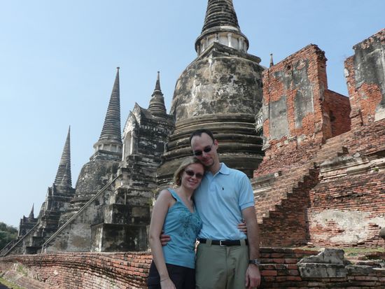Ausgepackt hatten wir ja für eine Nacht nix, also nur schnell unter die Dusche (leider nur kaltes Wasser, Haare waschen macht sich da echt blöde, brrrr!) und dann ging's wieder zum Sightseeing, wie sich das für echte Touris gehört. Haben uns bei einem kleinen Laden ums Eck 2 lustige Drahtesel ausgeliehen (80THB), denn die Innenstadt erstreckt sich doch über ein recht großes Gebiet, das wir bei der Hitze nicht unbedingt ablaufen wollten). Die Räder waren zwar etwas klapprig und Bremsen funktionierten gar nicht, aber da man bei den Temperaturen eh nicht schneller als 5km/h fahren kann, war das vollkommen ok. So konnten wir uns auch schon mal an den Linksverkehr gewöhnen. Oh weia! Im Stadtzentrum sind wir dann auf ein paar alte Ruinen gestoßen und unser Buch erklärte uns, dass das der ehemalige Königspalast war. Ayutthaya war mal über 400 Jahre lang die Hauptstadt des Siam-Reiches, bis es von Burmesen eingenommen wurde. Entsprechend prunkvoll muss es damals hier gewesen sein. Nun lassen das nur noch Ruinen erahnen. Aber auch die sind ganz hübsch anzusehen. Ist ein bisschen wie in Rom, nur dass die Ruinen anders aussehen. Wir sind dann von einem alten Tempel zum nächsten geradelt und haben auch den Wat Mahatat gefunden, wo diese bekannte Postkartenmotiv zu finden ist: Der in einem Feigenbaum eingewachsene Buddhakopf. Hübsch anzusehen! Einen riesigen liegenden Buddha haben wir auch gesehen. Und an einer "Elefanten-Touri-Station" sind wir auch vorbeigekommen. Dort können sich (hauptsächlich japanische) Touristen auf dem Rücken eines Elefanten zu einem Aussichtspunkt tragen lassen und dafür dann viel Geld loswerden. Die Elefanten selbst waren echt interessant, aber haben uns auch ziemlich leid getan. Trostloses Leben!