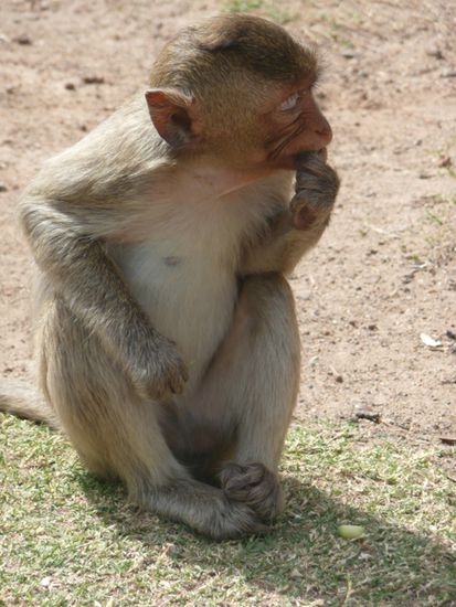 Hendi hat sich dann durchgesetzt und wir haben einen kleinen Umweg über Lopburi gemacht, die Affenstadt. Wir hätten es ja eigentlich nicht gedacht, aber der Abstecher hat sich wirklich gelohnt. In Lopburi lebt - laut Reiseführer - eine Horde von ca. 300 Affen, die sich hauptsächlich in der Innenstadt um 2 Tempeln herum aufhalten, wo sie auch gefüttert werden. Der Wahnsinn! Affen, wohin das Auge blickt, große, kleine, Babyaffen, schlafende, essende, sich jagende, um Essen bettelnde und Touristen bespringende...Da hatten wir echt was zu gucken und es ging immer nur "Oh wie süß! Oh wie lustig! Oh wie cool! Oh guck mal, was der witziges macht!..." An solchen Affen kann man sich einfach nicht satt sehen, die sind einfach zuuu menschlich. Das Besondere an der Sache war ja, dass es kein Zoo war, sondern die da einfach so wild in der Stadt leben.
