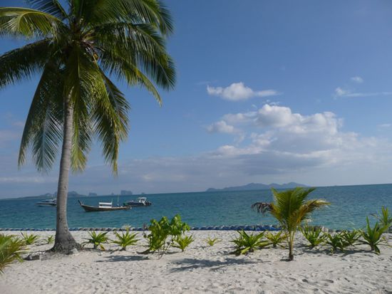 Hallo zusammen, heute hieß es Abschied nehmen von Koh Phi Phi. Um 5:40 Uhr klingelte der Wecker und Punkt 06:00 kam ein Wake up call, um uns an unsere Pläne für die Abreise zu erinnern. Hendi saß heute früh mehr auf der Toilette als ihr lieb war und so verzichtete sie lieber auf ein Frühstück. Marco hat sich schnell was reingestopft, denn viel Zeit bis zur Abreise blieb nicht. Mit uns reisten noch einige andere Gäste ab, die jedoch die übliche Route mit der offiziellen Fähre nach Tonsai Beach fuhren. Wir hatten am Abend vorher ja schon ein eigenes Longtailboot gechartert, da wir sonst nicht bis 08:00 Uhr am Pier in Tonsai Bay gewesen wären. Das wäre schlecht gewesen, da unsere Fähre zu unserem heutigen Ziel, Koh Mook, Punkt 08:00 Uhr ablegte. Dummerweise waren die netten Mitarbeiter an der Rezeption etwas im Stress und hatten uns nicht mehr so 100%ig auf Rechnung. 10 vor 07:00 wurde es uns dann auch langsam zu knapp und wir erkundigten uns, ob denn unser Transfer schon abreisebereit ist. Große Aufregung! Aber, das muss man den Thais lassen, sie bleiben IMMER, wirklich IMMER sehr freundlich. Unfreundliche Thai haben wir die ganze Zeit nicht wirklich erlebt. 5 nach 7 hatte unsere Guide von unserem gestrigen Trip, der uns mit einem freudigen Lächeln begrüßte, auch schon die Koffer ins Boot gewuchtet. Und ab ging die Fuhre, wie gesagt, 07:45 war Treffpunkt am Ticket Counter von Tigerline. Normalerweise ist das alles kein Problem, allerdings hatten zumindest wir beide die Wucht der Flut etwas unterschätzt. Hier gibt es wirklich einen beträchtlichen Unterschied zwischen Ebbe und Flut. Jedenfalls kamen wir nur im Schneckentempo vorwärts und schaukelten mächtig hin und her. Innerhalb weniger Minuten trieften wir vor Wasser und waren klatschnass. Das Gepäck hat es zum Glück überlebt. Ungelogen, wir hatten mehrere Male Angst, zu kentern. Nachdem wir die obere Spitze von Phi Phi Island umrundet hatten, schwammen wir quasi auf den Wellen mit und die Schaukelei hatte ein Ende, aber die ZEIT! Mittlerweile war es 07:15 und es lag noch ein großes Stück vor uns. Normalerweise hätten wir die Insel eigentlich fast einmal umrunden müssen, um an den entsprechenden Pier zu kommen. Unser Longtailbootfahrer entschied jedoch, wohl auch etwas auf die Zeit bedacht, einen anderen Weg zu wählen und fuhr uns zur anderen Strandseite der Landzunge. Dort kamen wir ca. 07:30 an. Hmmm....warum hält der liebe Fahrer denn bloß 50 Meter vorm Strand? Näher ging einfach nicht, wie sich herausstellte. Ebbe. Blöd! Also hieß es Gepäck durchs Wasser schleppen. Und wir haben echt viel - 2 Koffer und 3 Rucksäcke! Jeweils etwa eine Tonne schwer. Aber was hilft es. Unser Guide schnappte sich Koffer Nummer eins, ich den zweiten und Hendi irgendwie den Rest. Da wir eh schon nass waren, machte das keinen Unterschied. So schafften wir dann doch noch unsere Fähre und Punkt 8 legte sie ab, als die offizielle Fähre unseres Hotels gerade zum Anlegen klarmachte.