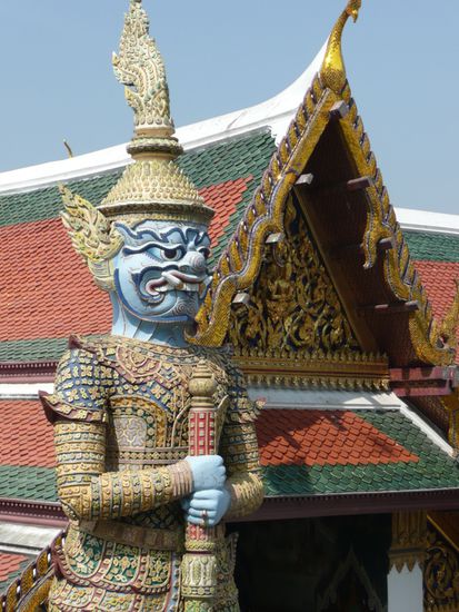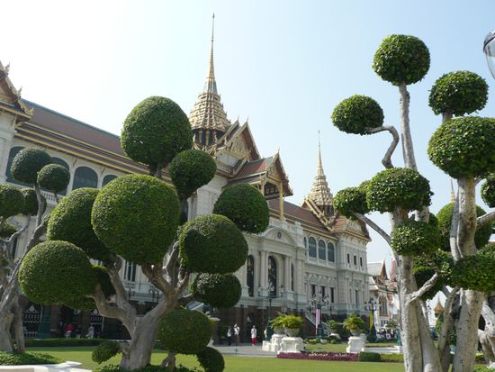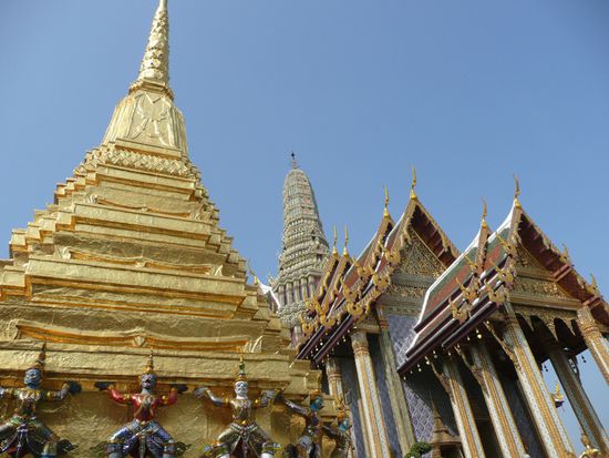 Zunächst einmal hallo aus Bangkok. Den vorletzten Tag stellten wir in das Zeichen von Kultur und Stadterkundungen. Nachdem wir uns heute früh relativ mühsam aus dem Bett gequält hatten, ging es ohne Frühstück (weil so toll war's nicht und hier werden an jeder Ecke die leckersten Sachen verkauft, so dass wir uns lieber so die Bäuche voll schlagen wollen) los Richtung Grand Palace (Königspalast). Nachdem Hendi eine "schicke" Bluse verpasst bekam (schulterfrei ist nicht erlaubt im Palastgelände), konnte die Besichtigung starten. Alles glitzerte und glänzte, war topgepflegt und gut bewacht. Der Wat Khaeo ist eben der heiligste Tempel des Landes. Den kleinen Jadebuddha konnten wir auch bestaunen, allerdings nicht filmen oder fotographisch festhalten. Ein kleines Model von Angkor Wat gabs auch zu sehen. Im Original ist die Anlage schöner . Alles in allem gefiel uns die riesige Palastanlage sehr gut, fast ein bisschen zu viel des Guten (alles gold und bunt und reich verziert). Wahrscheinlich ist es wirklich so, wie uns alle prophezeit haben - nach dem 3. Wat hat man alle gesehen...