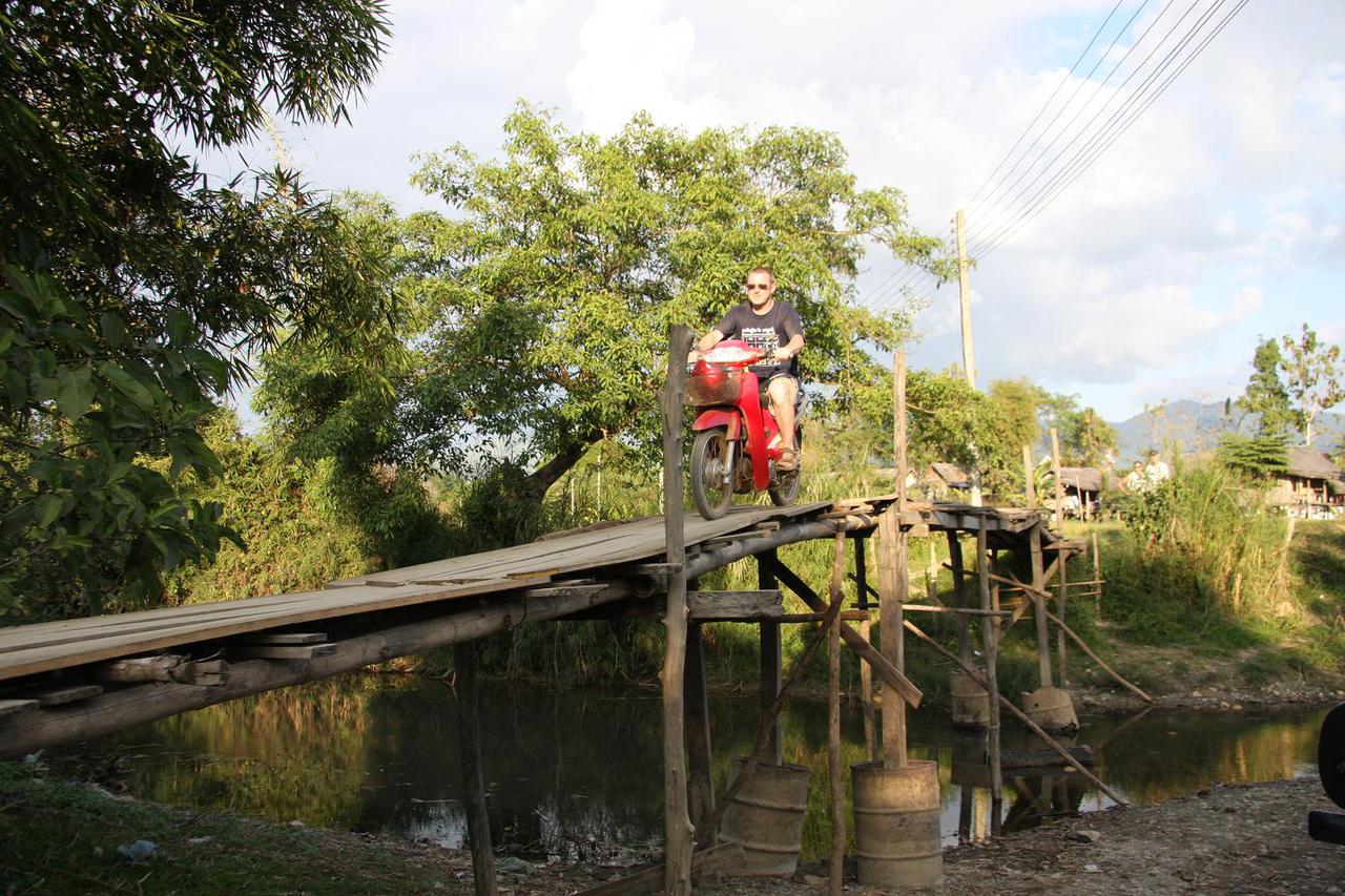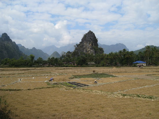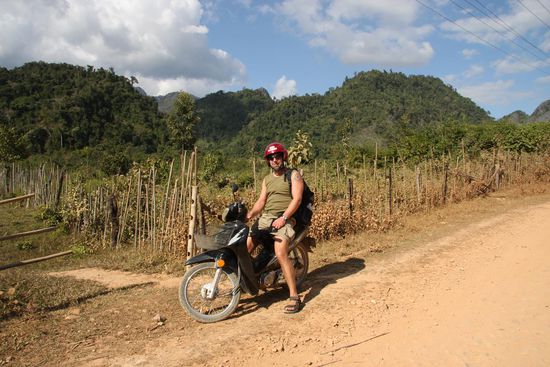 Die motorbike Tour hatte es in sich. Eigentlich wollten wir zum red cliff (von Vang Vieng nur ca. 10 km). Aber irgendwie hatten wir eine "offroad" Variante vorgezogen. Zuerst landeten wir mitten in einem Dschungel, dann ging es mit den motorbikes ueber ein Flussbett (ca. 70 cm tief) und schliesslich standen wir mitten in einem Reisfeld... und da wieder heraus zu kommen war gar nicht so einfach, da jeder Rain einen Absatz von ca. 40 cm hatte.