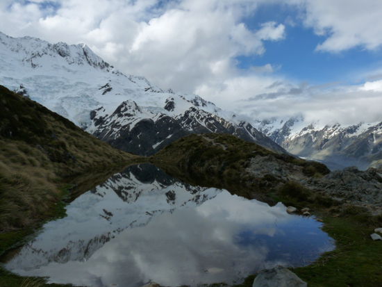 Matze hat gleich nochmal ne 3,5 stuendige steile Wanderung zu den Sealy- Tarns drangehaengt. Und siehe da, er hatte ne recht gute Aussicht auf den hoechsten Berg Neuseelands, den Mount Cook (ca. 3730m hoch) und die umliegenden Berge und Gletscher.