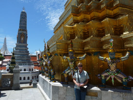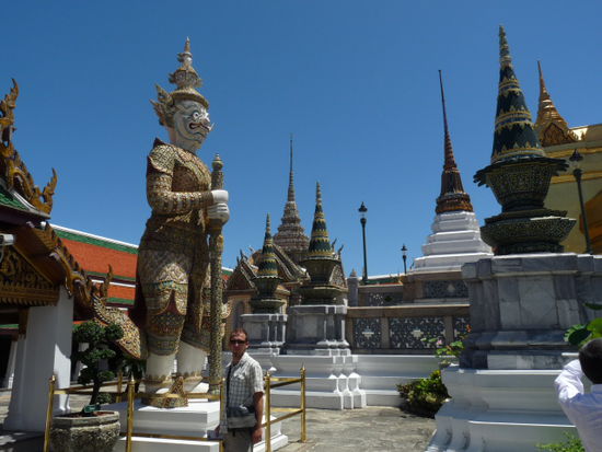 Am Sonntag war Sightseeing angesagt, aber da wir beide vor 5 Jahren schon einmal hier waren, und wir uns damals fast das gesamte "Tempel- Sigthseeing- Programm" reingezogen haben, blieb uns der Stress und Schweiss dieses Mal grösstenteils erspart. Das einzige, dass wir letztes Mal ausgelassen hatten, war der "Grand Palace", da man diverse Kleidungsvorschriften, wie geschlossene Schuhe, einhalten muss. Das ist bei den Temperaturen hier ziemlich heftig!! Diese Mal haben wir uns nicht davor gedrückt und es hat sich definitiv gelohnt! Gold, Glitzer und Prunk wo man hinschaut. Wirklich sehenswert, allerdings sehr teuer.