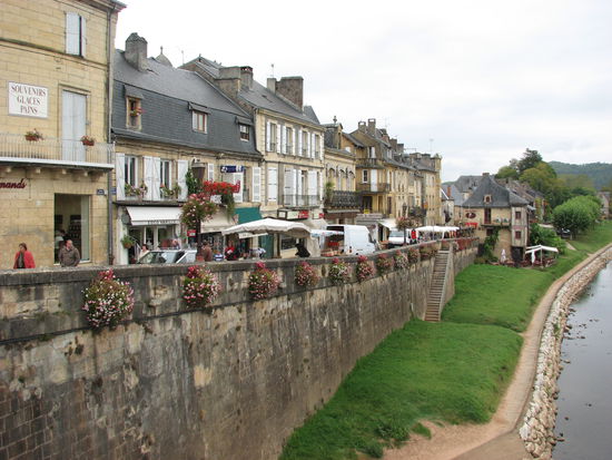 In Montignac angekommen, löst sich der Markt gerade auf. An einem Käsestand fällt uns etwas besonderes auf: le marquis noir de jahan - wir fragen nach und erhalten zur Antwort, ein Käsekuchen, der muß mit und wird am Vezèreufer nach vollendetem circuit historique zum Nachtisch angeschnitten. Dazu gibt es Kaffee aus der Thermoskanne und Teller aus dem Picnickoffer.