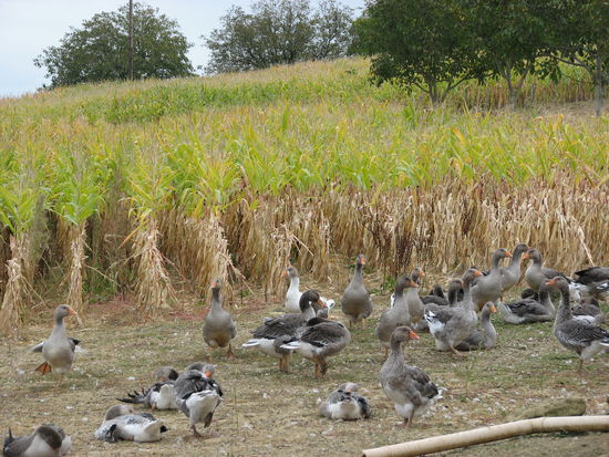 In Marquay sind sowohl Huberte Albie als auch Mme Espinasse beheimatet. Wir klingeln und eine mit Kittelschürze und Gummistiefeln gekleidete Frau (Mme Espinasse)kommt und zeigt uns die élévage d'oies. Die Ferme erhält die Küken im Alter von einem Tag, dann leben die Gänse drei Monate in Freiheit zwischen den Maiskolben. Erst danach kommen sie für 4 Wochen in den Stall, wo sie viermal am Tag mit 250 g Maisbrei gefüttert (maschinell gestopft) werden. Nach weiteren drei Wochen gelangen sie dann in die Dosen oder Gläser als Leberpastete, Rillettes, Confit aus Beinen, Flügel oder Hals oder werden auf dem Markt als frische Leber verkauft.