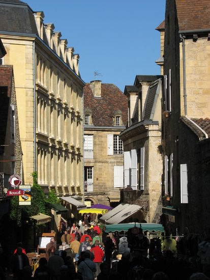 Heute ist Markttag in Sarlat, daher ist die Parkplatzsuche etwas aufwendiger, vor allem wenn man nicht weiß wie lange man bleiben will. Fast an der gestrigen Destille finden wir sogar einen gratuit.