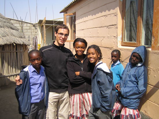 Dort besuchen wir Ernst, einen örtlichen Künstler, der seinen Lebensunterhalt durch das Bemalen von wunderschönen Kinder-T-Shirt verdient. Hier lernen wir außerdem die Klicklaute der Nama und Damara kennen, wir schaffen es aber nicht die Laute richtig auszusprechen. Vergisst man beim Reden die Laute, so kann es zu großen Missverständnissen kommen: "nam" mit dem einem Klicklaut bedeutet "lieben", mit einem anderen "töten" und dazu gibt es nochmals drei andere Schnalzlaute, bei denen "nam" noch mal etwas anderes bedeutet. Immerhin können wir uns "Gangans" (Danke) und "Madisa" (Hallo) merken und bringen es bei jeder Gelegenheit ein. Nach dieser etwas verwirrenden Spracheinführung fahren wir zu einer kleinen Bar, in welcher wir traditionelles Ovambo-Essen bekommen: selbstgemachtes Bier, Teig, Spinatsuppe, Mopane-Würmer, Bohnen und Nüsse. Überraschenderweise schmecken die Würmer am besten, man darf sie nur nicht allzu genau anschauen, denn dann sieht man ihren Mund und die Augen.