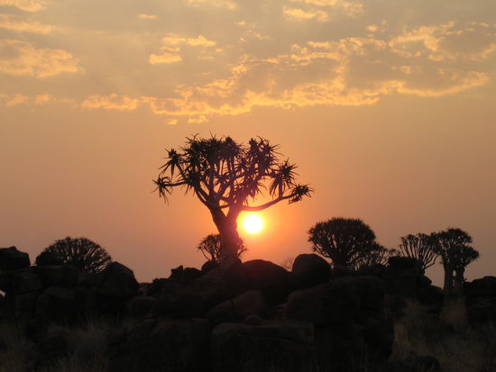 Da man außer Aussicht-genießen nicht so arg viel machen kann geht unsere Reise weiter über Seeheim und Keetmanshoop zum Köcherbaumwald-Camping, ein kleiner, sehr einfacher aber idyllischer Campingplatz. Wer jetzt denkt wir hätten in/bei einem Wald gecampt, der irrt, denn Wald bedeutet hier nur die Ansammlung von einigen Pflanzen mit großen Abständen dazwischen. Nichtsdestotrotz bieten die Köcherbäume ein tolles Fotomotiv in der Abendsonne. Während wir kochen, taucht plötzlich ein großer weißer Skorpion zwischen Susis Beinen auf und setzt sich genau neben Daniel. Zum Glück hat das Tier noch mehr Angst als wir und verzieht sich schnell im Steppengras. Es wird wieder Zeit etwas vorsichtiger zu sein und vor allem mal wieder festes Schuhwerk anzuziehen.