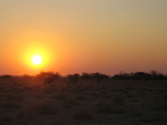 Als wir kurz vor Sonnenuntergang das Farmtor von Onguma passieren, sehen wir die ersten Antilopen, kleine Dik-Diks schauen uns mit ihren Riesenaugen an. Die Farm"straße" ist wie gewohnt nichts für unseren Kia, aber was soll man machen? Jammern hilft ja auch nichts. Als Trost stehen kurz vor unserm Campingplatz Zebras vor der tiefroten Sonne, so haben wir uns das schon eher vorgestellt als Polonaise durch den Spar zu tanzen. Nicht nur die Zebras und Antilopen erfreuen uns, auch der Campingplatz ist toll, es laufen einige Kudus (recht große Antilopen) am Platz vorbei und wir haben diesmal sogar unser eigenes Luxusduschhaus. So ein Bad zu Hause und niemand könnte sich beschweren (mal abgesehen von der Riesenspinne hinterm Klo).