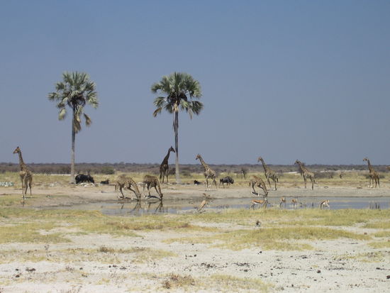Dort kaufen wir uns eine Übersichtskarte und schauen uns noch das Fort an, das einst von deutschen Truppen in die Wildnis gebaut wurde. Doch wir sind ja nicht wegen des Forts hier, sondern wegen den zahlreichen Tieren, für die Etosha weltbekannt ist. Heute wollen wir den östlichen Park anschauen, wir fahren eine kleine Schotterstrecke, für die wir aber fast den ganzen Tag verbrauchen, so fasziniert sind wir von den vielen Tieren. Aber von Anfang an: Die ersten Tiere sind Dik-Diks am Straßenrand, es folgen viele Springböcke und ein paar Gnus, die sich im Schatten der wenigen trockenen Bäume ausruhen. Nach ca. 1 Stunde sieht Susi in einiger Entfernung die ersten zwei Elefanten. Wow, was für schöne und gewaltige Tiere! Es fällt schwer weiterzufahren, aber nur wenige Kilometer weiter stehen Giraffen am Wegrand und grasen die oberen Blätter der Bäume ab, die sonst niemand erreicht. Wir scheinen für die Tiere nichts besonderes zu sein, umgekehrt ist das aber schon der Fall! Doch es soll heute noch viel schöner werden als "nur" 3 Giraffen zwischen Bäumen. Das erste Wasserloch das wir erreichen zeigt sich von seiner schönsten Seite. Unter den zwei riesigen Palmen sonnt sich eine größere Gnuherde, sowie die kleinen, aber sehr schönen Springböcke. Wir entscheiden uns hier eine kleine Rast zu machen - im Auto versteht sich, denn aussteigen ist im Nationalpark nicht erlaubt. Eine Konfirmandenblase könnte einem ernsthafte Probleme bereiten, vor allem weil man bei 30 Grad und Sonne pur auch genügend Wasser trinken sollte. Nachdem wir ein paar Minuten stehen, erscheinen plötzlich ein paar Giraffen am Wasserloch. Und es werden immer mehr! Nach kurzer Zeit finden sich ca. 15 Giraffen ein und trauen sich langsam an den Antilopen vorbei ans kühle Nass. Diesen schlaksigen Tieren beim Trinken zuzuschauen ist mehr als interessant. Da sie so groß sind, kommen sie mit ihrem Mund nicht einfach so zum Wasser herunter. Es hilft nur Beine spreizen oder so umständlich umknicken, dass es physikalisch unmöglich aussieht. Man könnte stundenlang dem friedlichen Beisammensein der Tiere zusehen!