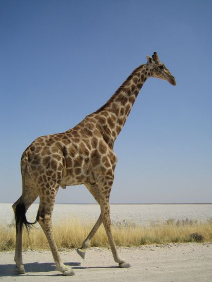 Dennoch fahren wir irgendwann weiter, und als ob wir noch nicht schon genug Glück mit Giraffen hatten, stolziert vor uns auf der Straße eine richtig große. Wir versuchen sie zu überholen, aber sie will nicht und liefert sich mit uns ein hartnäckiges Rennen. Bei 45 km/h steigt sie aber aus und hat genug davon neben uns her zu joggen.