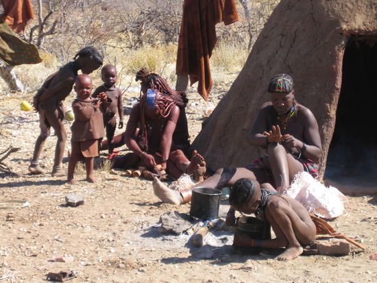"Naua" oder "Morro" - so werden wir morgens im Himbadorf bei Gelbingen von den Himbafrauen und -kindern begrüßt. Die Himba sind ein Volk, das versucht so traditionell wie noch vor 200 Jahren zu leben. Leider ist das in der heutigen Zeit nicht mehr uneingeschränkt möglich und das Dorf ist auch ein bisschen ein Showdorf. Trotz allen zwiespältigen Gedanken ist der Besuch sehr interessant und wir erfahren viel über das Leben des Naturvolkes, so z.B. das kein offenes Blut innerhalb des Dorfes fließen darf. Frauen mit ihrer Regel müssen daher das Dorf für ein paar Tage im Monat verlassen und wohnen "irgendwo" außerhalb. Von diesen Traditionen gibt es noch einige hier und auch die Lehmhütten sind nicht besonders gut entwickelt. Dennoch wirken die Frauen sehr glücklich, und die Kinder strahlen um die Wette.