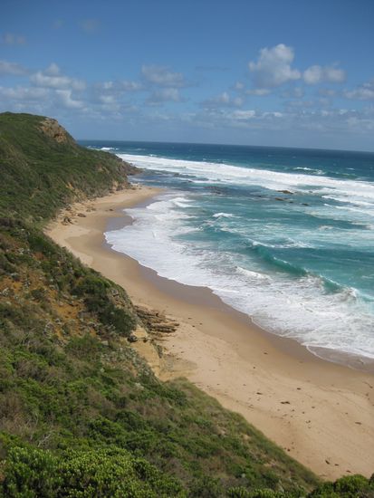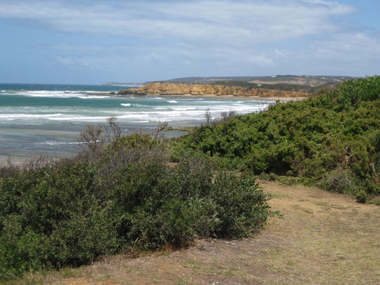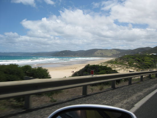 Von unserem kleinen, aber eigentlich sehr unpersoenlichen und ungemuetlichen Campingplatz in Breamlea ging unsere Reise auf der "Great Ocean Road" los. Zunaechst fuhren wir nach Torquay, von dem aus die "Great Ocean Road" los geht. Dieses kleine Staedtchen ist fuer seine Surfstraende bekannt. Wir haben es genutzt, um uns mit Wasser und Lebensmitteln einzudecken und ausgiebig zu fruehstuecken . Aber natuerlich haben wir uach den Strand besucht und ein paar Windsurfern und Kitern zuschauen duerfen.