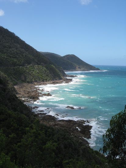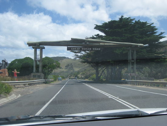 Die "Great Ocean Road" schlaengelt sich in ihrer Laenge von ca. 300 km ueberwiegend direkt an der Kueste entlang. Von dort aus gehen dann immer mal wieder Lookouts ab, von denen man verdammt schoene Aussichten geniessen kann. Die meiste Zeit faehrt man aber.