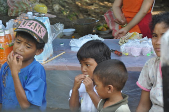 Nachdem wir mit dem Minibus zur außerhalb gelegenen Busstation gefahren sind, stellt sich heraus, dass der Bus den wir nehmen müssen übervoll ist. Zuerst sah es so aus, als könnten wir nicht mitfahren. Aber da hatte ich doch das Pack- und Stapelgeschick der Lao unterschätzt. Mir wurde mein Rucksack aus der Hand genommen und mit vereinter Kraft schoben und schubsten die Lao mich so lange vorwärts in den Bus, bis ich fast dem Fahrer auf dem Schoss saß. Dann kam eine Hand von oben und drückte mich nach unten, da saß aber schon jemand und es gab nur ein klitze kleiner Spalt freie Fläche zwischen zwei Leutchen. Macht nichts, die Hand drückte so lange, bis mein Popo die Oberfläche des Motors (liegt zwischen Fahrer und Beifahrersitz) berührte. Ich hatte plötzlich einen Sitzplatz . Thai musste an der Tür stehen die nicht mehr zuging, aber er ist ja auch ein Einheimischer und wird sich schon zu halten wissen. Dann ging es los. Die Holperpiste (Straße kann man nicht sagen) bis nach Hat Sa wo die Boote lagen ging eine Stunde rauf und runter durch den Dschungel. Der Bus war völlig überladen und bei jeder Kuhle krackste und schabte es am Boden des Busses. Der Bus ächzte und es hörte sich an, als wenn er die nächste Kehre nicht mehr überleben würde (auch wir nicht  Das gleiche galt für Bäume die über die Straße ragten, acuh ihre Äste ließen 'Federn',denn der Bus war mindestens doppelt so hoch wie er normalerweise ist. Aber wir kamen an. In diesem kleinen Ort herrschte ein reges Treiben. Wir hatten nicht viel Zeit um uns umzuschauen, mussten wir doch ein Boot finden, das noch auch andere Passagiere hatte, sonst fahren sie nicht. Thai ging alleine zum Hafen um zu verhandeln. So wird es billiger.Er fand ein Boot das uns in 8 Std. nach Muong Khiao bringen würde. Mit an Bord waren noch vier weitere Einheimische. Touris gab es außer mir keine. Das Boot ist ca. 1 Meter breit und ca., 15 Meter lang. Es gibt außer sehr schmalen Brettern (fast Latten), die quer gelegt wurden, keine Sitzfläche und schon mal gar keine Rückenlehne. Ich setze mich ganz nach hinten, wo das Gepäck verstaut wurde hin, und lege mir meinen Rucksack so zu recht, dass ich mich einigermaßen anlehnen konnte. Der Fluss ist richtig wild. Die Landschaft wieder einmal wunderschön, wir fahren mehr oder weniger die ganze Zeit durch den Dschungel. Ab und an sieht man kleine Dörfer am Fluss und ich frage mich, wie die Leute weit weg von allen Straßen, dort leben können. Denn nicht jeder hat ein Boot. Manchmal halten wir unterwegs um Passagiere und Ware aufzunehmen. Immer kommen Kinder angerannt und freuen sich am Tag eine kleine Abwechslung zu haben. Wenn sie dann noch mich entdecken, geraten sie völlig aus dem Häuschen. Bei einem Halt steigen ein Mann der eine Person auf dem Rücken trägt (zuerst dachte ich es wäre ein ca. zehnjähriges Mädchen) und ein kleiner Junge von ca. 2 Jahren, ein. Er platzierte die Frau auf dem Gepäck. Ihre Beine sind gelähmt und sie hat keine Kraft mehr im Oberkörper um sich zu bewegen. Auch ihren Kopf zu halten erscheint unglaublich schwer. Sie hat wohl große Schmerzen. Sie ist im Brust- und Halsbereich übersät von Hämatomen. Die Familie muss sehr sehr arm sein. Der kleine Junge ist total verschüchtert und der Vater hat alle Hände voll zu tun seine Frau einigermaßen zu betten. Ich packe mein Kissen aus und lege es ihr in den Rücken. Ein kleines Lächeln streift mich. Oh je ich könnte heulen, leider kann ich für sie nicht mehr tun. Der Vater sitzt bei ihr auf dem Boden vor dem Gepäck und versucht sie zu halten und jede Minute bittet sie ihn sie umzubetten. Der kleine Junge sitzt auf dem gleichen Brett wie ich, mit großen Augen schaut er immer wieder zu mir. Ich versuche keinen Blickkontakt herzustellen, denn dann würde er wohl noch mehr Angst bekommen. Die Frau macht mir durch Zeichensprache verständlich, dass sie keine Luft bekommt. Ab und an fährt der Man ihr unter den Rippenbogen und massiert sie. Thai, der vor mir sitzt erzählt mir, dass die Leute auf den Dörfern erst alleine versuchen die Krankheit zu heilen und wenn es doch schlimmer wird, sie einen Arzt aufsuchen. Natürlich werden sie nur behandelt, wenn sie Geld zum bezahlen haben. Die Frau erzählt mir (Thai übersetzt), dass sie bald sterben würde und schaut mich mit so unglaublich traurigen Augen, dass ich mich wegdrehen muss um meine Tränen zu verstecken. Ich habe das Gefühl man reißt mir mein Herz aus der Brust. Und ich kann nichts tun, außer ein bisschen mit ihnen zu sprechen. Die Stromschnellen sind manchmal so heftig, dass der kleine Junge Schwierigkeiten hat auf dem Sitz hocken zu bleiben. Ohne Blickkontakt lege ich meine Hand um ihn und halte ihn fest. Der Papa schaut bejahend zu mir und sagt dem Kleinen etwas. Nun ist das Eis ein bisschen gebrochen und er lässt es mit sich geschehen. Ich krame in meinem Rucksack ein kleines Bilderbuch heraus und gebe es ihm. Sofort hält er es mit zwei Händen fest und schaut ganz verstohlen auf das Büchlein. Als ich versuche das Büchlein zu öffnen versteckt er es hinter seinem Rücken. Und mir wird klar, dass er noch nie in seinem Leben ein Buch in der Hand hielt und auch nicht wusste was man damit macht. Er hatte wohl Angst, dass ich es ihm wieder weg nehme. Nach ca. 2 Stunden merke ich, dass dem kleinen tapferen Burschen immer wieder die Augen zu fallen und er zu schwanken anfängt. Kurz entschlossen packe ich ihn und bette ihn auf meinem Schoß. Er ist so müde, dass er keinen Widerstand leistet und ich merke, dass er innerhalb kurzer Zeit schwer wie ein Sack wird, in meinem Arm einschlummert. Der Papa erzählt, dass sie schon eine ganze Nacht unterwegs waren und er sich nicht richtig um den Kleinen kümmern konnte. So schlief der Junge drei volle Stunden in meinem Arm. Ich hatte den Eindruck, dass er schon lange nicht mehr so tief geschlafen und diese Geborgenheit und den Schutz gefühlt hatte. Als ich glaubte mein Rücken zerreiße, 