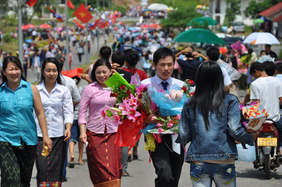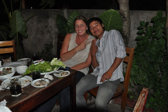 Heute Morgen nach dem Frühstück (8.30) wurden wir (Staff und Freunde (15 Pers. ) von einem Minivan, den Thavone für uns organisiert hatte zur Universität gebracht. Thavone musste schon früher dort sein um Schritte einzustudieren, die sie während der Zeremonie machen mussten. Mehr als 1000 Absolventen waren da und hatten auch viele Angehörige und Freunde mitgebracht. Tradition ist, dass die Familie und die Freunde den Absolventen Blumen, T'Shirts oder Stofftiere (große Pubärs, Luftballons z.B.) schenken. Es sah in meine Augen alles so kitschig aus (wie ein großer Jahrmakrt), aber für die Leute hat es Tradition. Ich kaufte ebenfalls einen Strauß Rosen für Thavone. Er bekam so viele Blumen, dass man ihn hinter dem Blumenmeer, die er von vielen Freunden und Bekannten nicht mehr sehen konnte. Der Premierminister von Laos sprach und alle Studenten mussten sich auf einer großen Bühne aufstellen und bei Verkündung des Namens in einer gewissen Schrittfolge nach vorne treten und das Dokument engegen nehmen. Es war allerdings nur der Umschlag, darin befand sich noch nichts, denn das eigentliche Examenszeugnis bekamen sie erst ein bis zwei Wochen später. Das sah alles sehr mechanisch und ernst aus. Im Anschluss gab es eine große Fotosession. Es war unglaublich heiß. So heiß, dass der Teer auf der Straße weich wurde und ich natürlich mit meinem Schuh darin stecken blieb . Alle lachten, außer mir, war ich nun doch geteert, zum Glück nicht gefedert . So gegen 13 Uhr waren wir zurück. Erst einmal ausruhen, denn am abend sollte ja die Party steigen. Am Abend waren ca. 40 Gäste geladen, wir saßen an zwei großen Tafeln, es gab super leckeres Essen. Verschiedene Gemüse und Nudeln waren auf großen Platten angerichtet, dazu noch viele Kräuter, Soßen, gegrillter Fisch und rohe Kohlblätter. Die Kohlblätter nahm man in die Hand und legte nach Wunsch alle o.g. Zutaten hinein, träufelte Soße (scharf) darüber und und rollte es wie eine Frühlingsrolle auf. Es schmeckt hervorragend. Dazu gab es noch Fischsuppe und verschiedene gegrillte, kleingeschnittene Würste und eine kleine Art WanTans. Es herrschte ausgelassene Stimmung und wir tranken den ganzen Abend Lao Whisky mit Ice, Coke, Lemon und Gin Tonic. Außerdem gab es später noch Wodka mit Gin Tonic zu trinken und natürlich Wasser, das spielte eine geringere Rolle für manche.